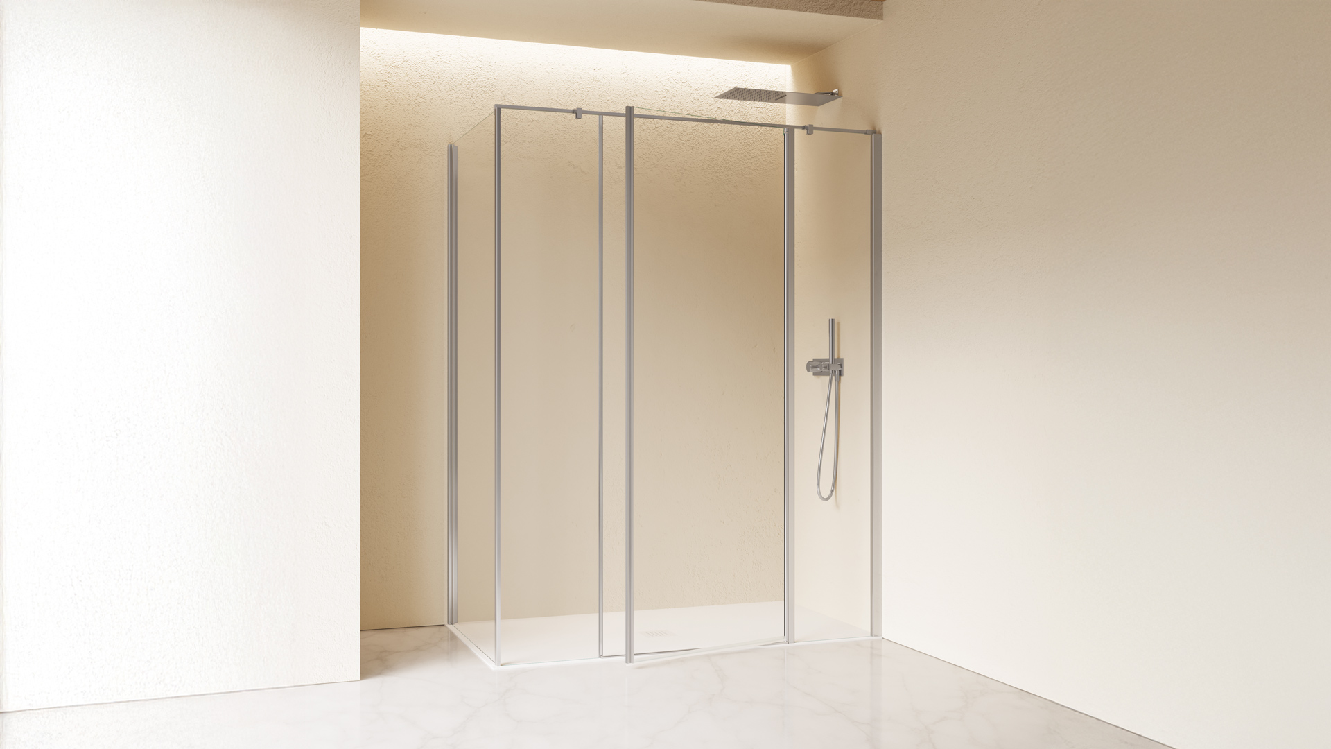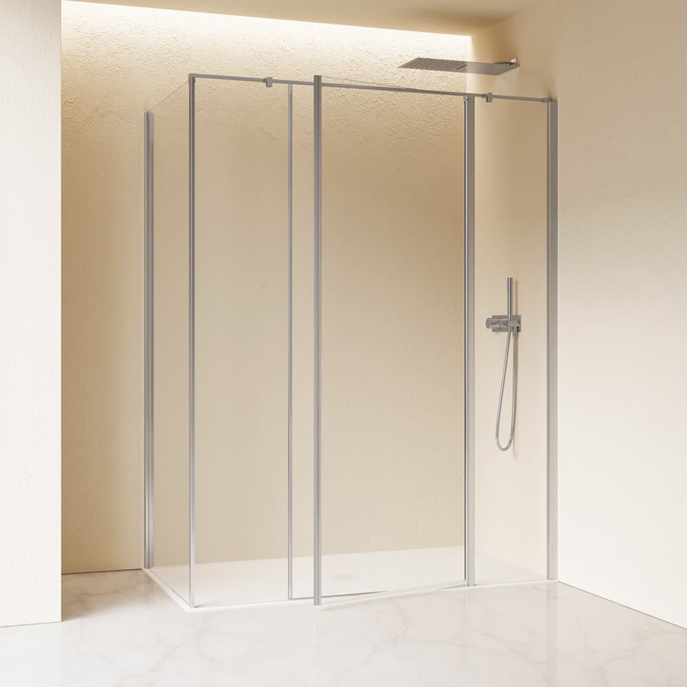 Configurazione ad angolo formata da porta battente con doppia parete fissa in linea più parete fissa. L'apertura dell'anta è sia verso l'interno che verso l'esterno. Maniglia installata a tutta altezza sul bordo della porta.