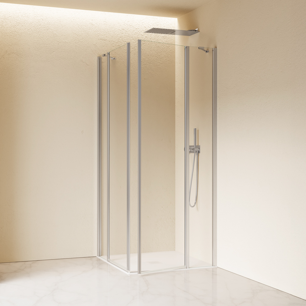 Configurazione ad angolo formata da due porte battenti con parete fissa in linea. L'apertura dell'anta è sia verso l'interno che verso l'esterno. Maniglia installata a tutta altezza sul bordo della porta.
