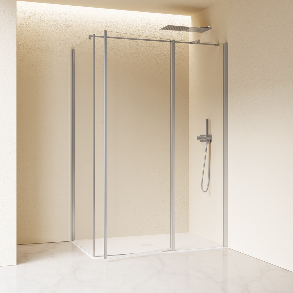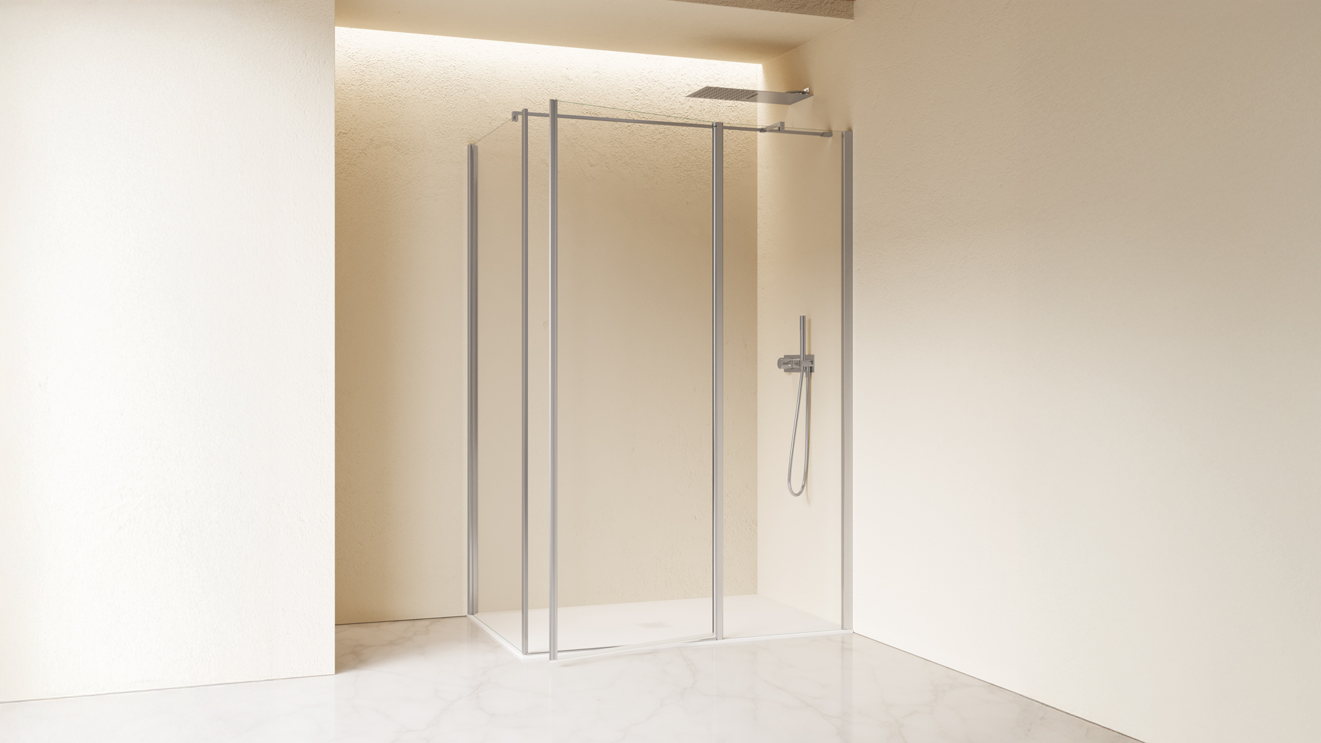Configurazione ad angolo formata da porta battente con parete fissa in linea più parete fissa. L'apertura dell'anta è sia verso l'interno che verso l'esterno. Maniglia installata a tutta altezza sul bordo della porta.