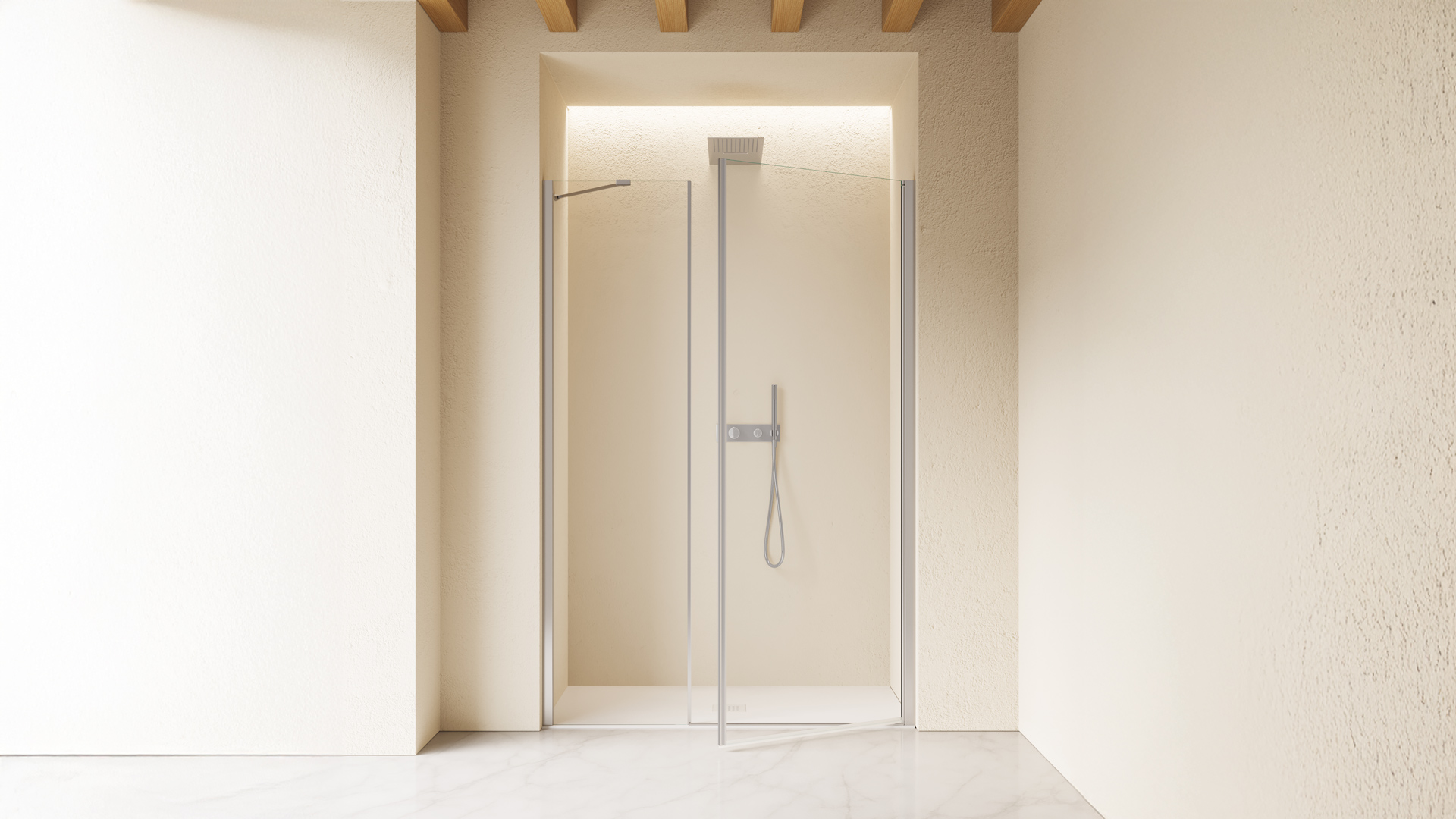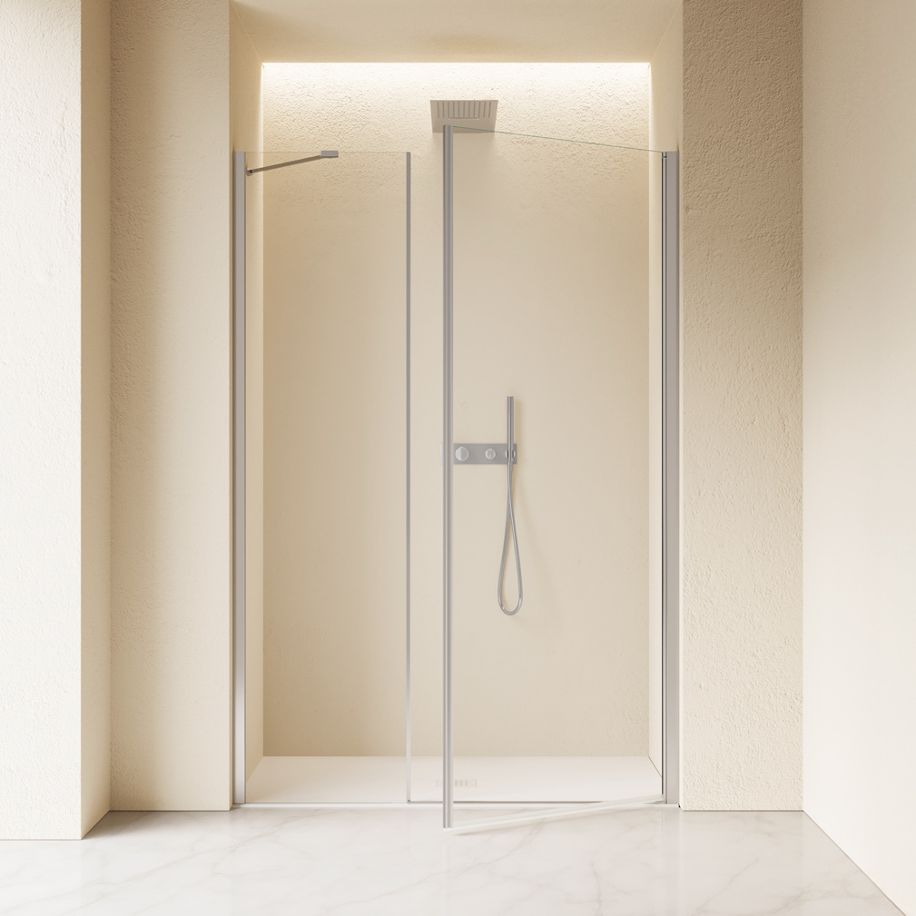 Apertura a porta battente su parete fissa in linea. L'apertura dell'anta è sia verso l'interno che verso l'esterno. Maniglia installata a tutta altezza sul bordo della porta.