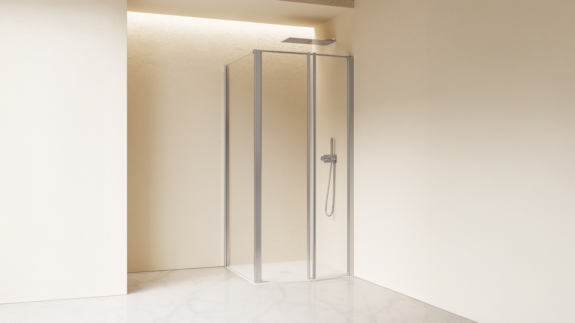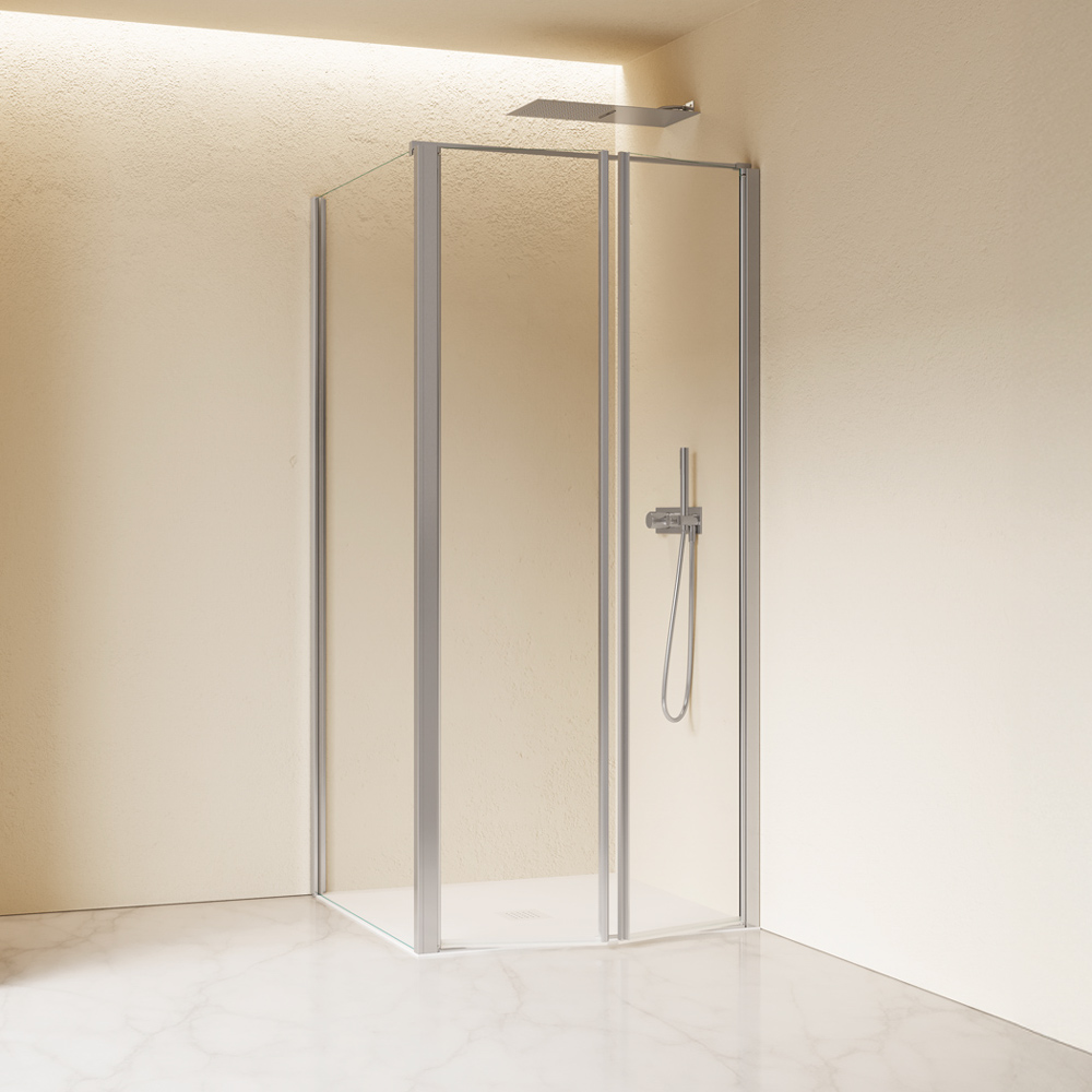 Configurazione ad angolo formata da due ante con apertura a saloon più parete fissa. L'apertura delle ante è sia verso l'interno che verso l'esterno. Maniglia installata a tutta altezza sul bordo della porta.