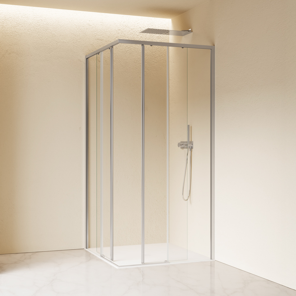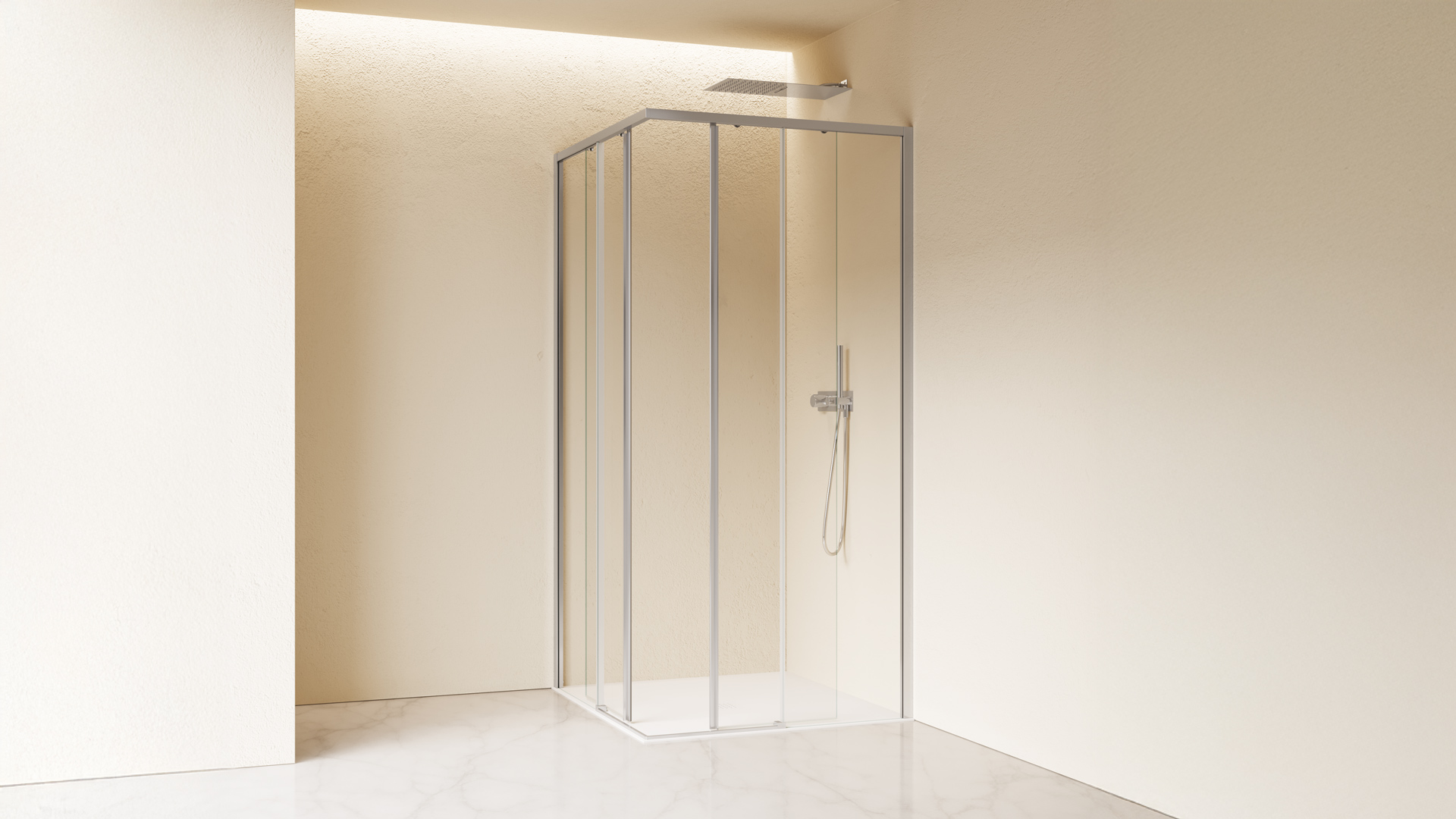 Configurazione ad angolo con porte scorrevoli. Maniglia installata a tutta altezza sul bordo della porta. Apertura data dalla somma dell'apertura di due lati.