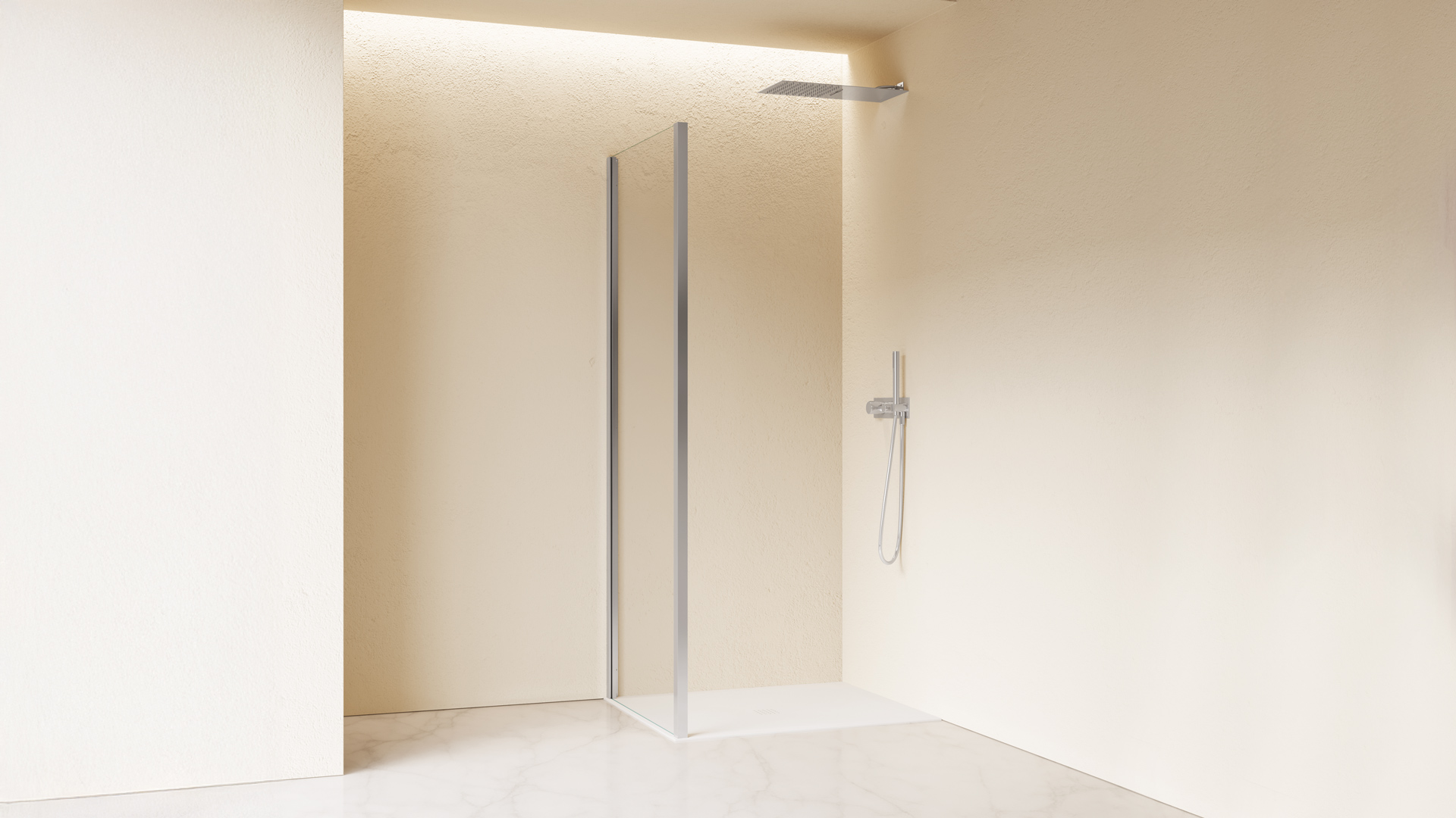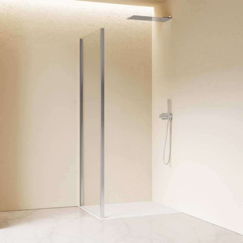 Parete fissa per abbinamenti. É possibile utilizzarla in abbinamento al modello di parete doccia selezionato per realizzare installazioni ad angolo o a tre lati quando possibile.
