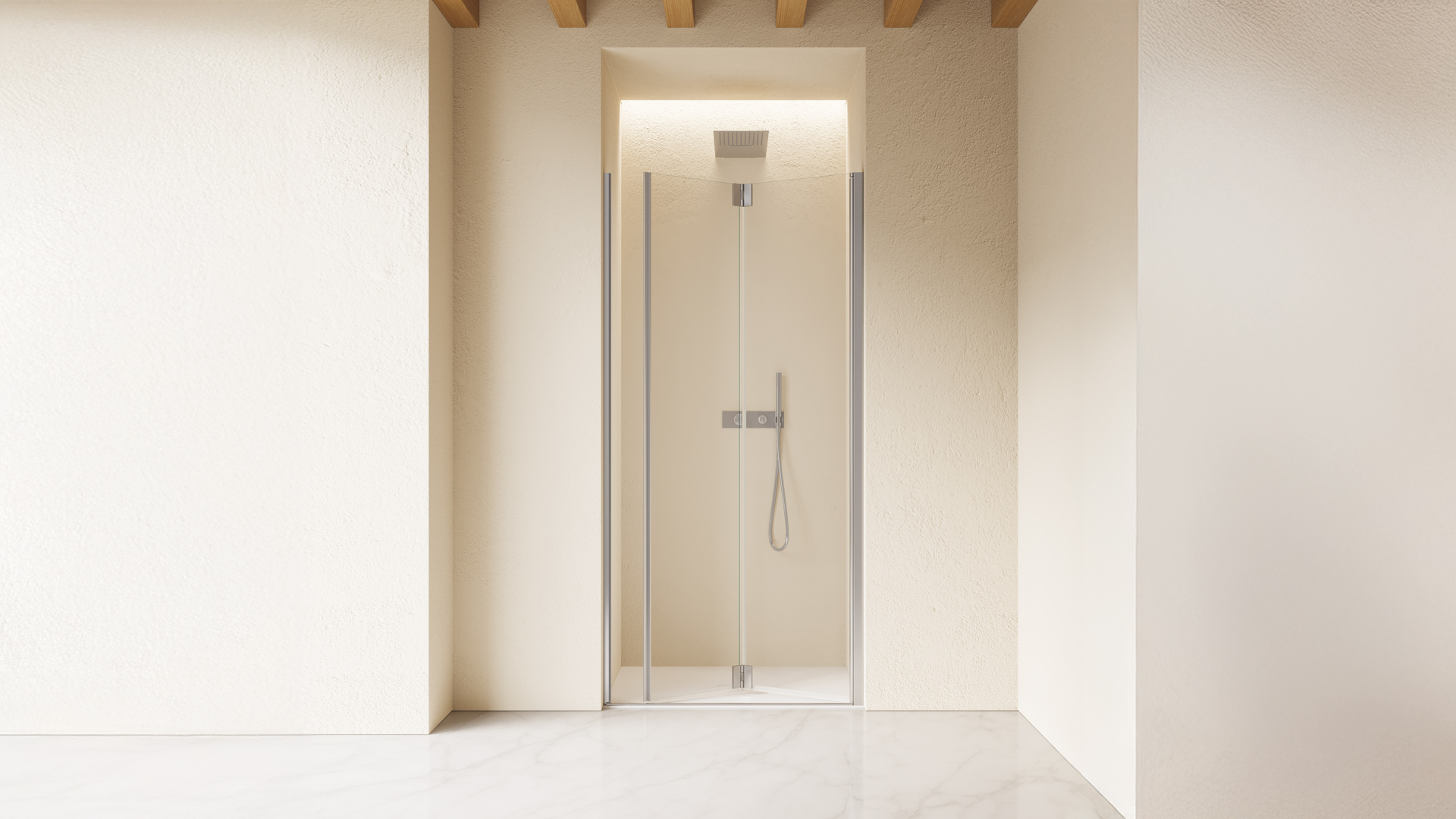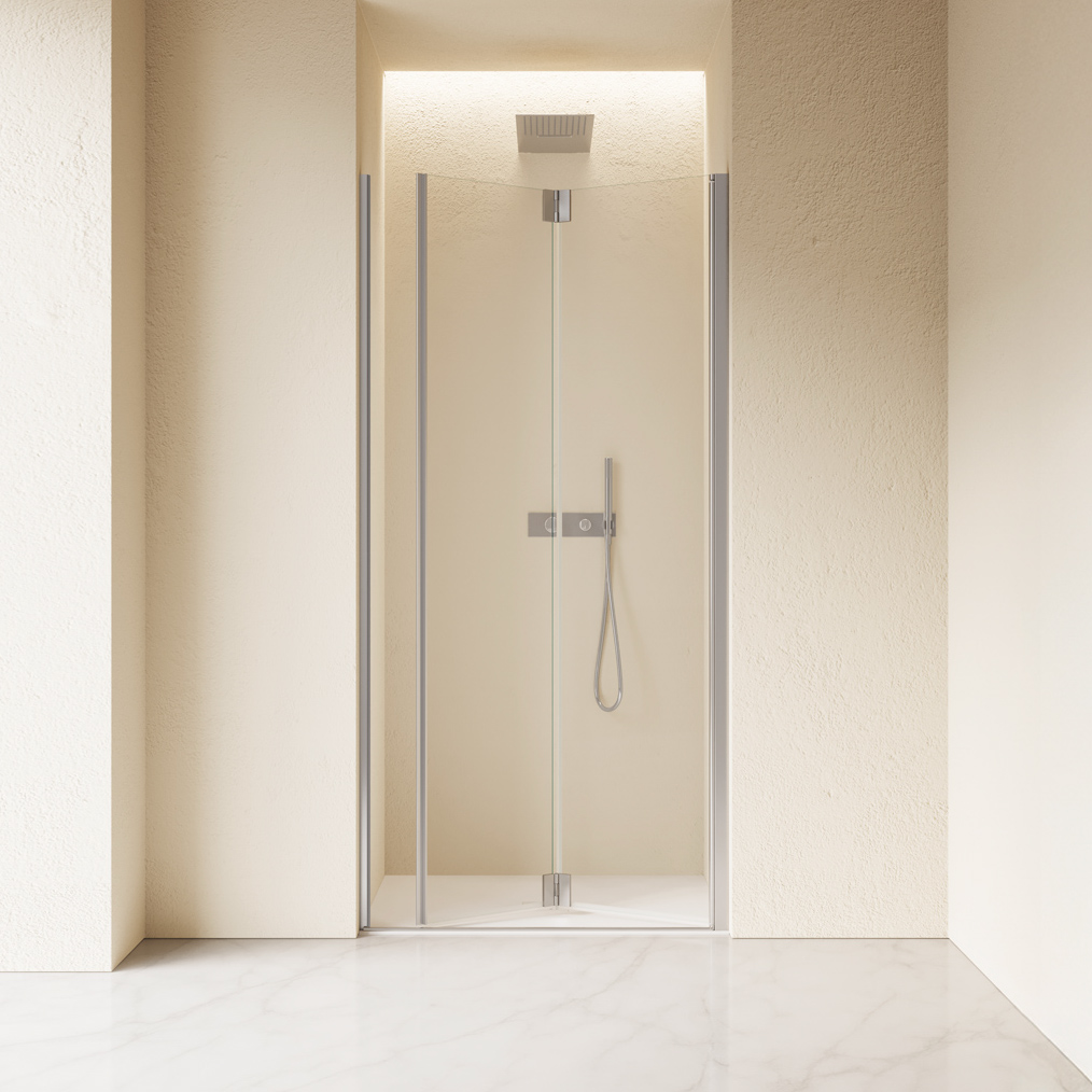 Configurazione a due ante con apertura a soffietto. L'apertura delle ante è sia verso l'interno che verso l'esterno. Maniglia installata a tutta altezza sul bordo della porta.