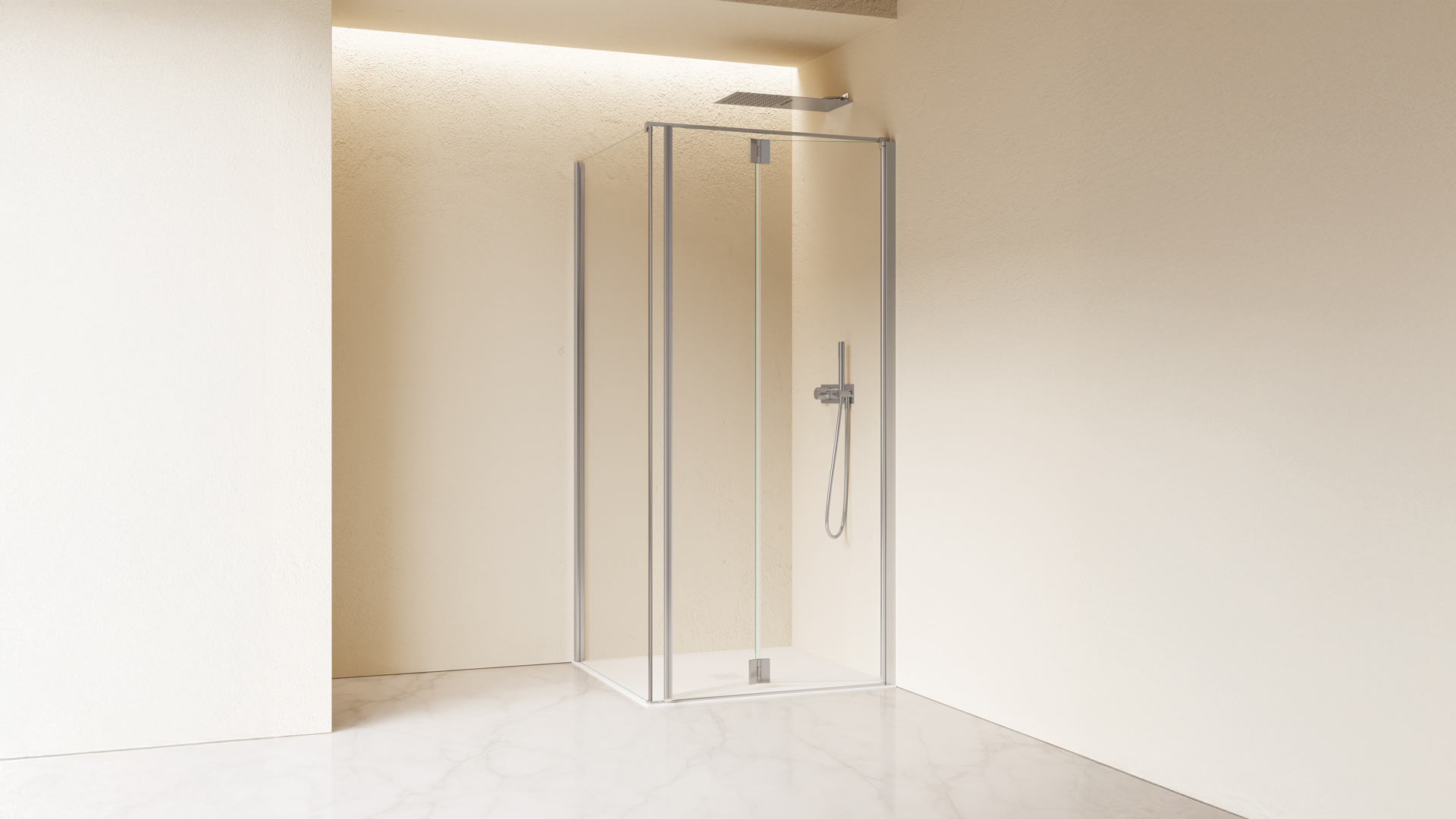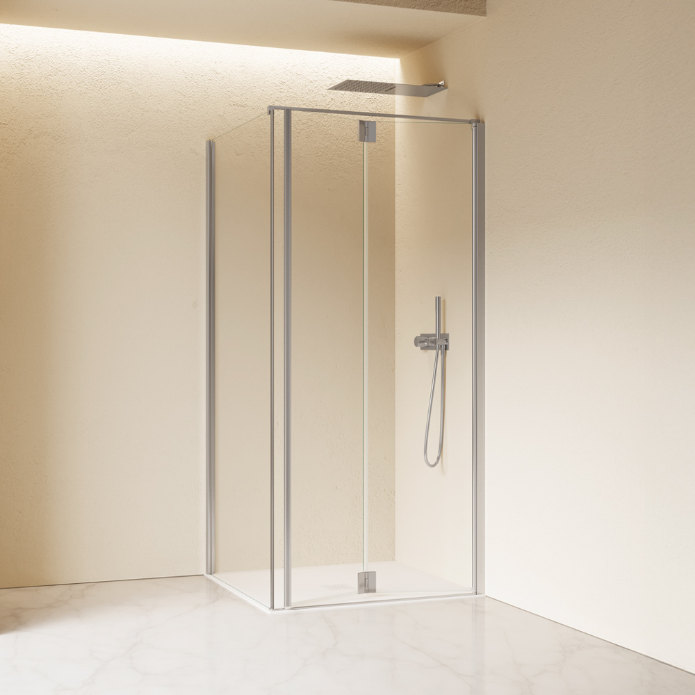 Configurazione ad angolo formata da una porta a soffietto più parete fissa. L'apertura delle ante è sia verso l'interno che verso l'esterno. Staffa di sostegno fornita di serie. Maniglia installata a tutta altezza sul bordo della porta.