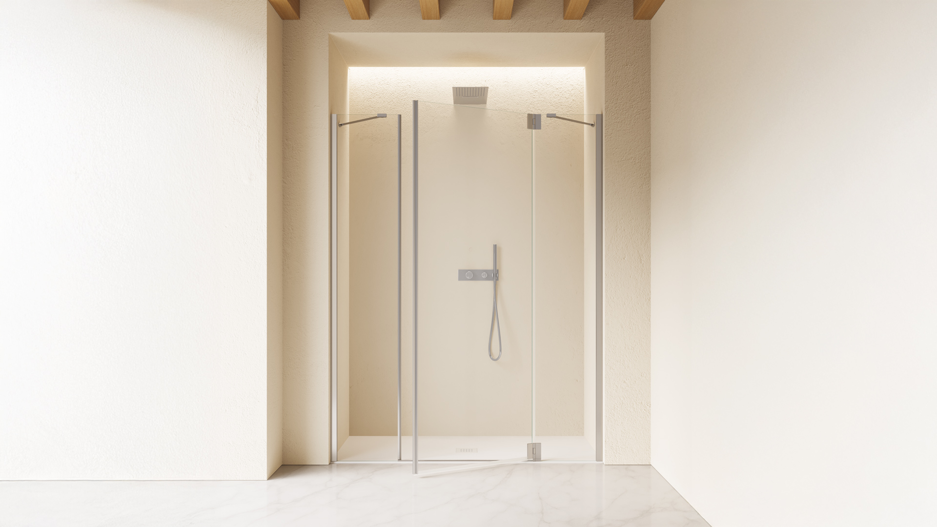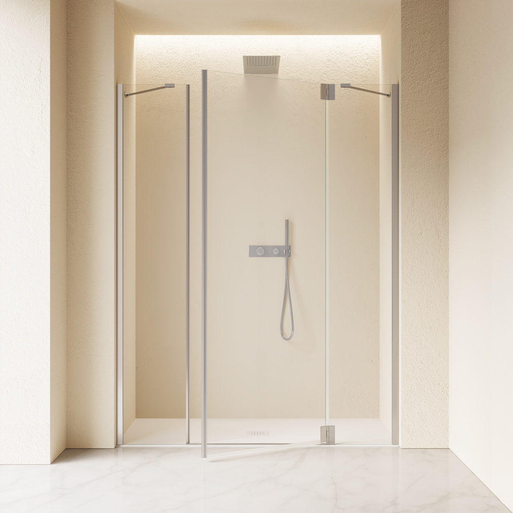 Apertura a porta battente con doppia parete fissa in linea. L'apertura dell'anta è verso l'esterno. Zanca snodata fornita di serie. Maniglia installata a tutta altezza sul bordo della porta.