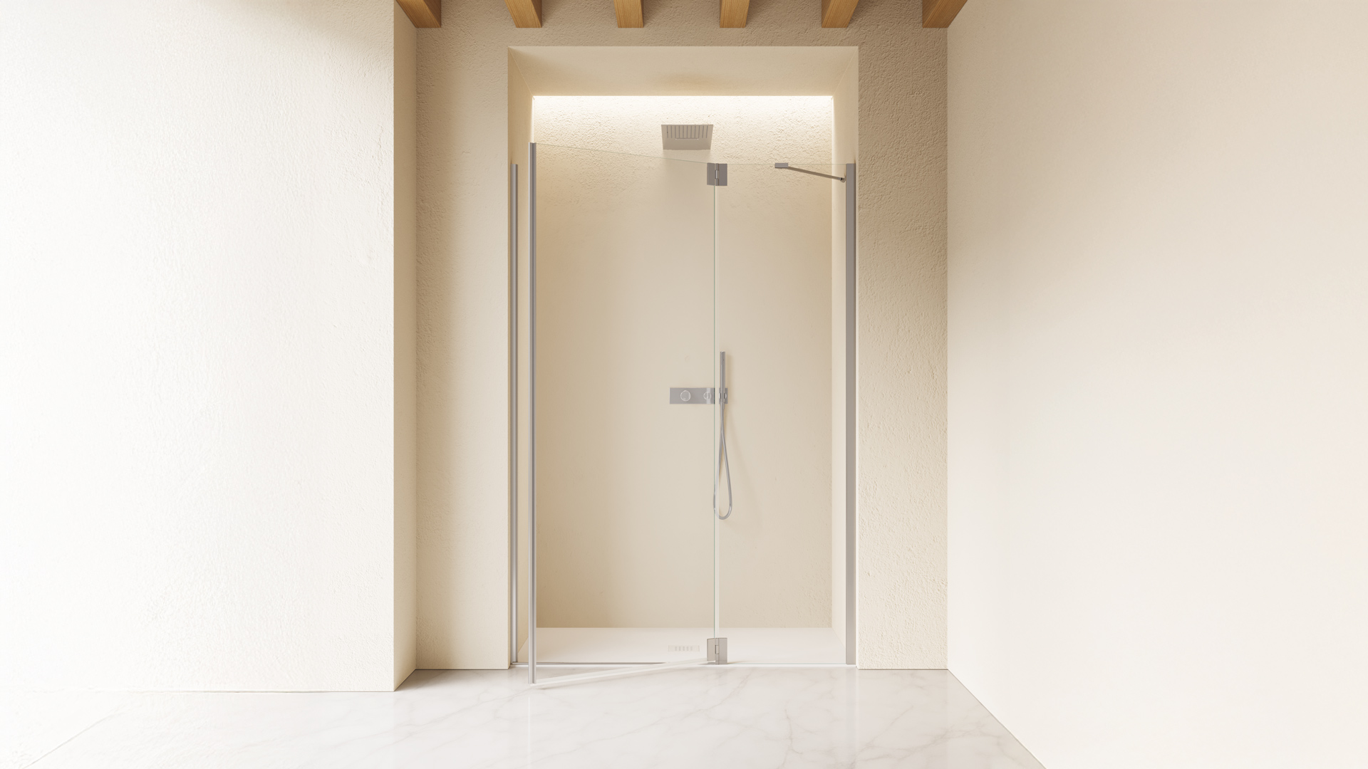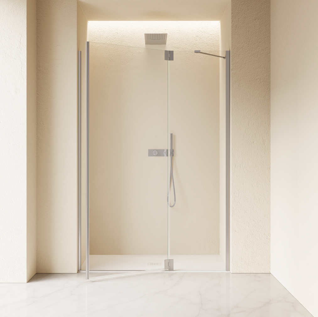 Apertura a porta battente con parete fissa in linea. L'apertura dell'anta è verso l'esterno. Zanca snodata fornita di serie. Maniglia installata a tutta altezza sul bordo della porta.