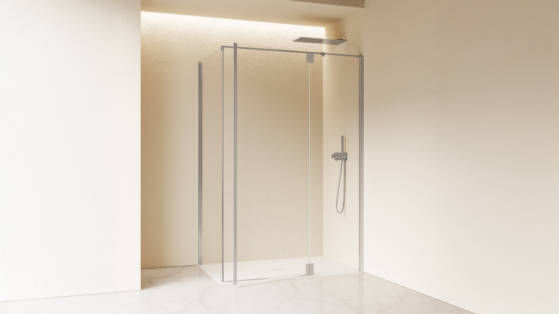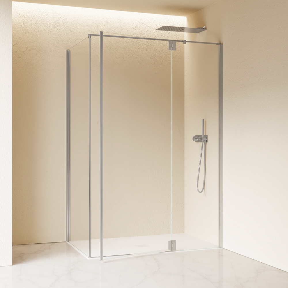 Configurazione ad angolo formata da porta battente con parete fissa in linea più parete fissa. L'apertura dell'anta è verso l'esterno. Staffa di sostegno fornita di serie. Maniglia installata a tutta altezza sul bordo della porta.