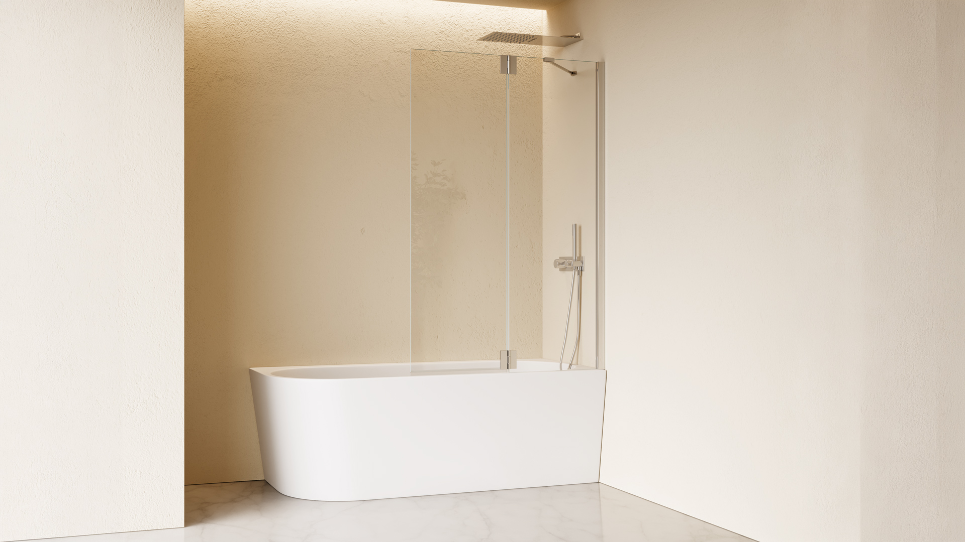 Parete vasca con apertura a porta battente con parete fissa in linea. L’apertura dell’anta è sia verso l’interno che verso l’esterno.