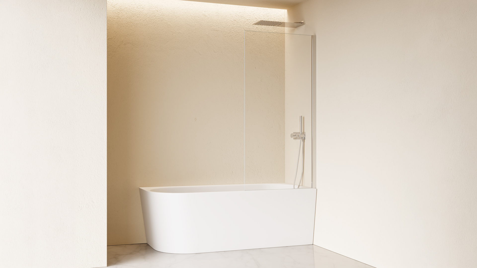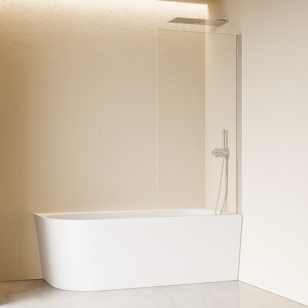 Parete vasca ad anta fissa. Possibilità di personalizzazione sono il vetro squadrato o arrotondato.