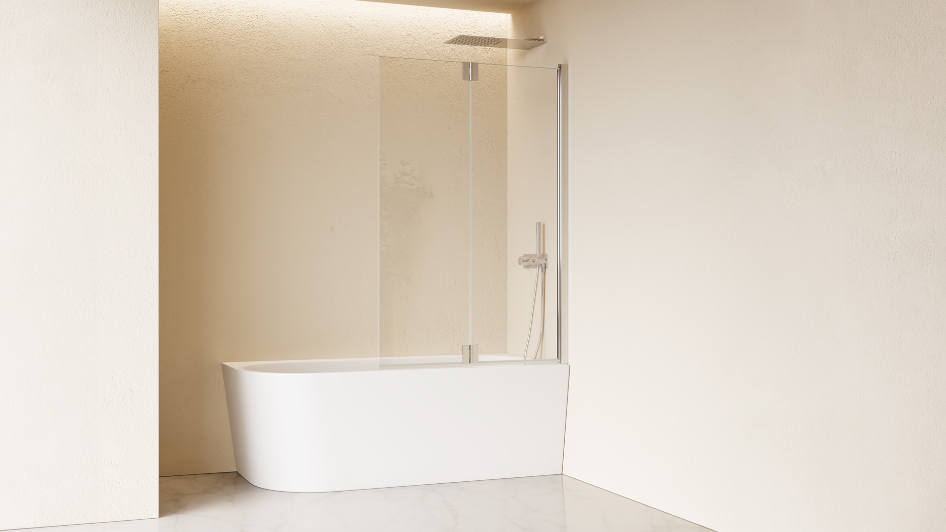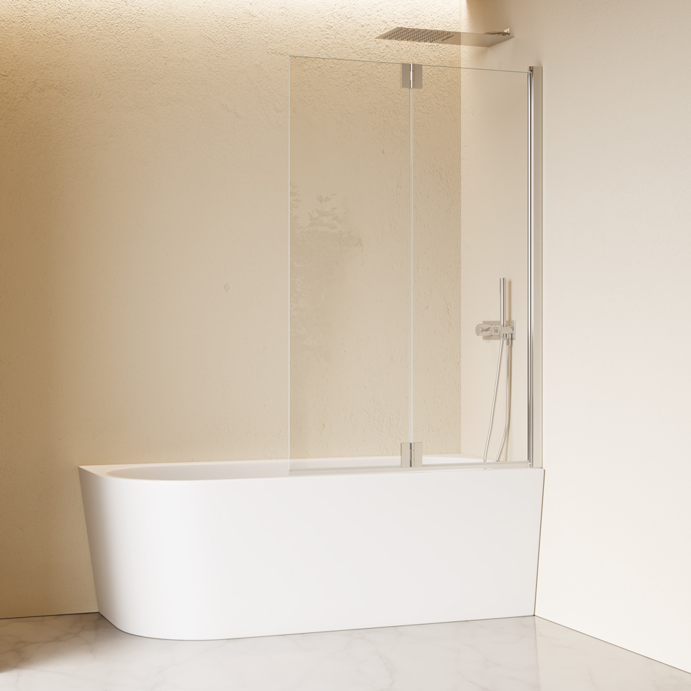 Parete vasca a due ante ripiegabili apribile sia verso l’interno che verso l’esterno. L’anta è dotata di profilo metallico inferiore in finitura dotato di guarnizione per evitare perdite d’acqua dal bordo. L’anta terminale è arrotondata.