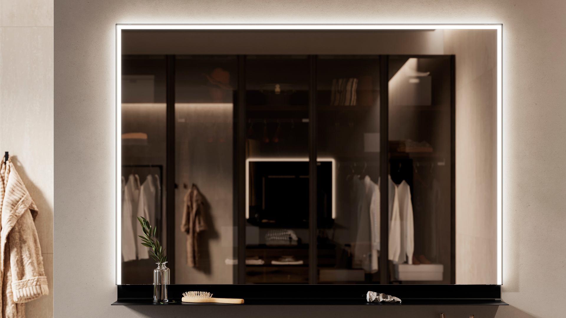 Specchio con telaio in alluminio verniciato. Spessore vetro 4mm. Luce frontale e ambientale su 3 lati per un effetto moderno. Optional: antifog